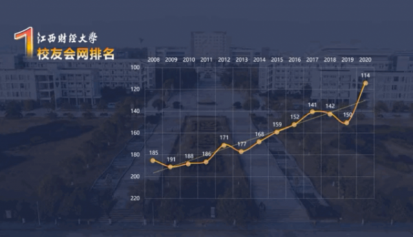 2019年12月27日,中国校友会团队发布了“2020中国财经类大学排名”,江财位列财经类高校第7名,全国高校第114名。在艾瑞深校友会全国高校排行榜,从2010年前后的190名左右,跃升至2020年第114名,排名突飞猛进。