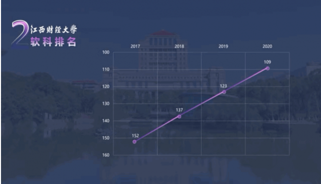 “2020年软科中国大学排名”江财在总榜位列全国第109名;“2020软科中国财经类大学排名”江财位列第7名。自2017年财经高校被纳入软科全国高校排行榜以来,从152名跃升至2020年的第109名,取得历史最好成绩。