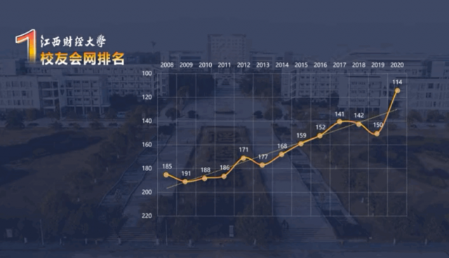 2019年12月27日,中国校友会团队发布了“2020中国财经类大学排名”,江财位列财经类高校第7名,全国高校第114名。在艾瑞深校友会全国高校排行榜,从2010年前后的190名左右,跃升至2020年第114名,排名突飞猛进。