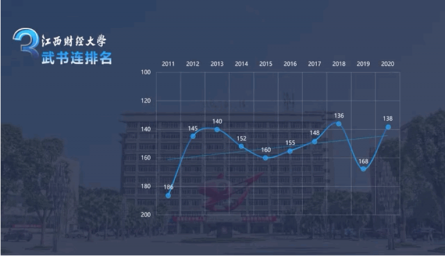 “武书连2020中国大学排行榜”江财位列全国财经类高校第6名;“武书连2020中国大学社会科学排行榜”江财位列全国第53名,江西省内第1名。从2011年的第186名,跃升至2020年的第138名,在全国财经类高校排名提升至第6名。