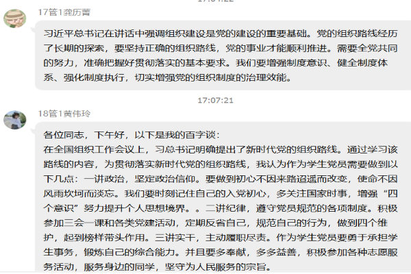 组织建设是党的建设的重要基础,我们党近百年的发展历程证明,建设好、管理好我们的党组织离不开健全的组织制度。对此,黄伟玲同志颇有感触:“在全国组织工作会议上,习近平总书记明确提出了新时代党的组织路线。通过学习,我认为作为学生党员需要做到以下几点:一讲政治,坚定政治信仰。要做到初心不因来路迢遥而改变,使命不因风雨坎坷而淡忘。二讲纪律,遵守党员规范的各项制度。三讲实干,主动履职尽责。作为学生党员要勇于承担学生事务,锻炼自己的综合能力。并且要多奉献,多多益善,积极参加各种志愿服务活动,服务身边的同学,坚守为人民服务的宗旨。”