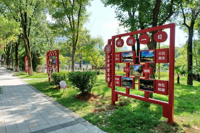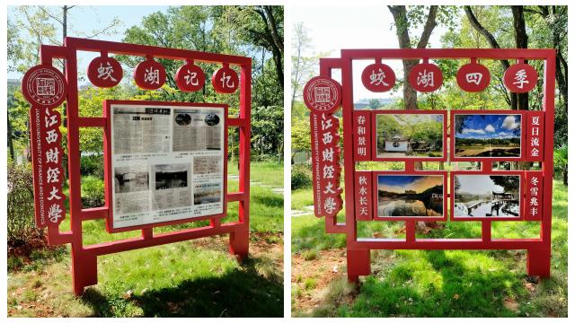 这些文化标识牌包含“蛟湖记忆”“蛟湖四季”“蛟湖一日”三个版块,分别展示我校师生校友发表过的有关蛟湖的文章和蛟湖春夏秋冬、一天早晚的不同风景。在设计上,采用“江财红”为主色调,以镂空设计增加透视效果,与周围景物融为一体;在位置上,则选择通向图书馆的主干道旁,既不破坏蛟湖原有的园林设计,又与图书馆外的名人训词、灯杆上的文明创建公益广告互相呼应。为全方位地展示蛟湖文化内涵,放假前后,在湖长袁雄副校长指示下,宣传部、文明办翻阅校报创刊以来的所有报纸,收集、补拍各个时段的照片,展现了做实做细的“绣花功夫”。