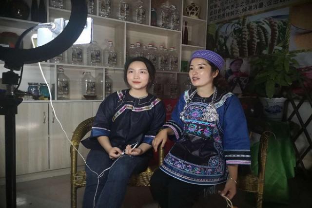 8月28日上午10点,直播正式开始,店主黄蓉与两位主播身穿苗族传统服饰盛装出境。直播活动伊始,团队成员简要地介绍了财税攻坚小分队前来宗地镇的目的。随后,黄蓉姐介绍了小米酒的制作工序,讲述了小米酒的原材料是本地特产的金色小米,具有口感好、品质纯的特点。虽然现在酿酒设备层出不穷,具备各种全自动、出酒率高等各种优势,但小米酒作为宗地镇特色农产品的代言,为了保证小米酒的质感,一道道工序皆由店主亲力亲为,采用传统的手工工艺制作,代代相传,发扬光大。