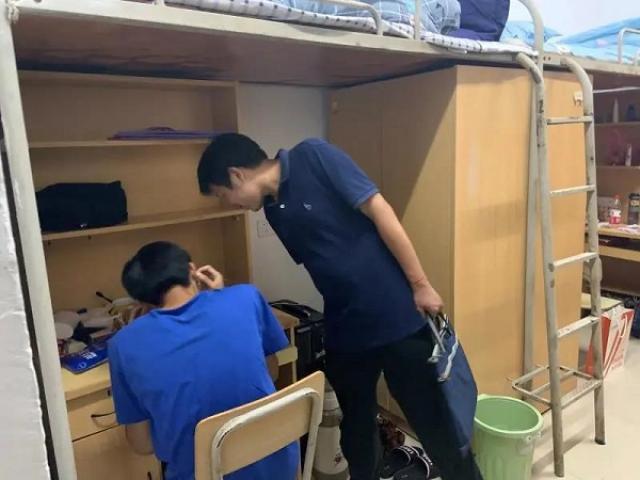 在走访过程中,廖波老师发现部分新生寝室出现了热水器无法使用的问题,他与学生干部一起帮助新生连接热水器的电源线,为新生解决问题。