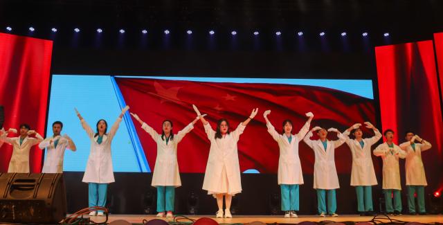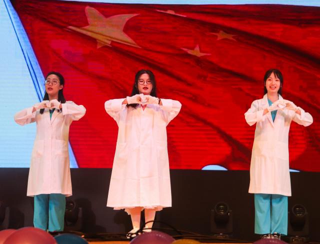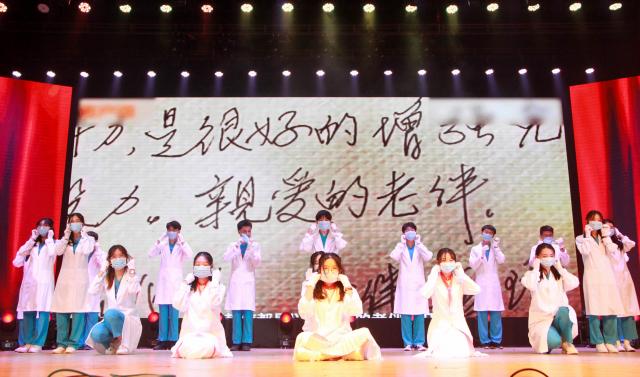 在轻缓的背景音乐中,一男一女诉说着对抗疫英雄的颂赞之语,手语操队员们身着白衣、庄严肃穆的伫立一旁。朗读声止,伴随着感人心扉的歌声,手语操队员变换手形,用双手传达着歌词中蕴含的爱国情谊。最后在“此生无悔入华夏,来世还应在中华”的肺腑之言中,手语操队员们举起双手,将观众的情绪推向顶峰,掌声许久未歇。