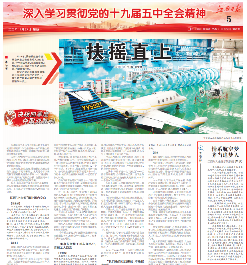 今年前三季度,景德镇航空小镇航空产业实现营业收入195.6亿元,同比增长10%。航空产业已经成为景德镇市三大超百亿支柱产业之一,直升机产销量占国产直升机份额60%以上。11月23日,在江西日报5版“深入学习贯彻党的十九届五中全会精神”专题版块中,我校金融学院教授严武以“情系航空梦 齐当追梦人”为题,对“扶摇直上”——景德镇航空小镇实现产业突破,产业链提升,培育航空产业新优势,朝着航空小镇旺起来的目标迈进的先进事迹进行了深度解读和点评。
