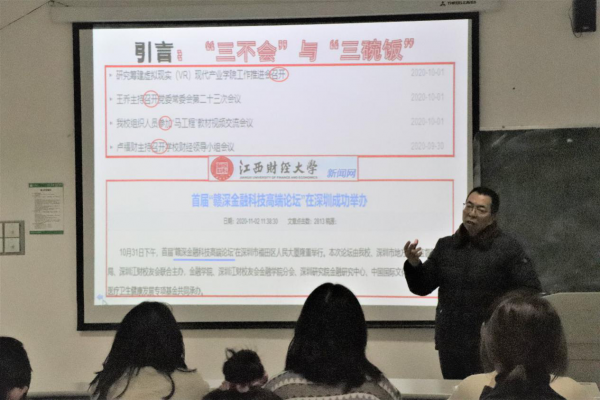 11月28日下午,文明校园建设办公室主任喻春龙应邀于麦庐校区大学生活动中心展开授课,带来主题为“新闻写作:讲好新时代的江财故事”课程培训。