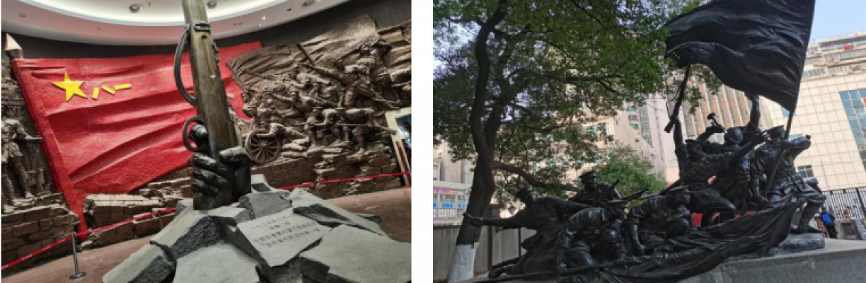 进入新馆,首先映入眼帘的是一座反映出当年南昌起义将士“坚定信念,不屈不挠,勇于开拓,敢为人先的八”一精神的大型铜塑。据了解,这座铜塑是为纪念建军八十周年,中国人民解放军总政治部赠送给此馆的。底座上“一九二七年八月一日凌晨二时中国共产党打响了武装反抗国民党反动派的第一枪”透露出了中国人民在共产党的领导下,不畏强敌,前赴后继的坚强决心和彻底革命的坚定意志。