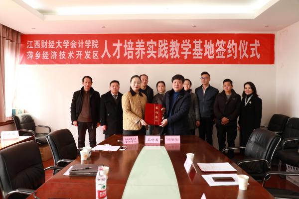 1月14日上午,江西财经大学会计学院与萍乡经济技术开发区于蛟桥园校区北区综合楼四楼第二会议室举行了“人才培养实践教学基地”签约仪式。院党委书记黄雨虹、党委副书记肖安生、副院长李宁、副院长曹玉珊、党政办公室负责人闵建辉、研工办主任曾海龙、团委副书记王鹏、辅导员陆灵娇及萍乡经济技术开发区党工委委员、党群工作部部长段练一行六人出席了本次活动。签约仪式由肖安生主持。