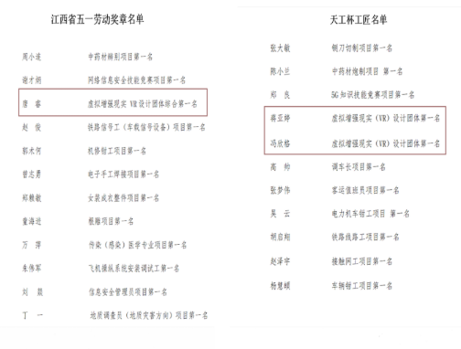 近日,由省总工会主办的全省“天工杯”十大示范性技能大赛——第二届虚拟(增强)现实职工职业技能竞赛获奖名单揭晓,艺术学院数字媒体艺术专业海归博士唐睿带领团队(18级数字媒体艺术专业在校生冯欣格、蒋亚婷)在虚拟(增强)现实VR设计中获得团体综合第一名。唐睿博士获得了“江西省五一劳动奖章”的荣誉称号,蒋亚婷、冯欣格两位同学获得“天工杯工匠”的荣誉称号。