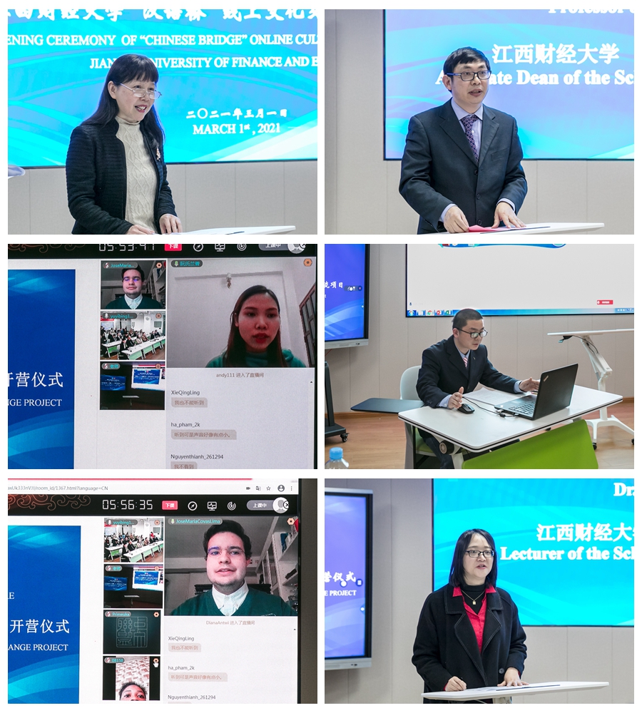 3月1日下午,由教育部中外语言交流合作中心主办、我校承办的“聆听中国声音品味中国文化”——“汉语桥”线上文化交流项目开营仪式在计算机实践教学中心五楼多媒体室举行。副校长刘小丽、原副校长王小平,国际合作与交流处、计算机实践教学中心、旅游与城市管理学院、人文学院等单位负责人,海外教育学院师生代表以及来自24个国家的近200位外国师生、项目组成员相聚云端,通过中文联盟平台在线参加了开营仪式。开营仪式由国际合作与交流处处长肖珑主持。