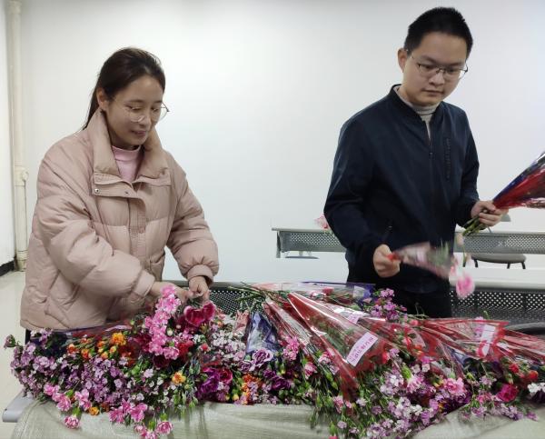 正午时分,数位学生干部将三百枝鲜花放至22栋活动室,等待各班班支前来取花并下发至各个女生寝室。各班班支精挑细选,挑出鲜艳挺拔的花朵送至各女生寝室,为班上女生送上祝福与关爱。活动室人来人往,络绎不绝。
