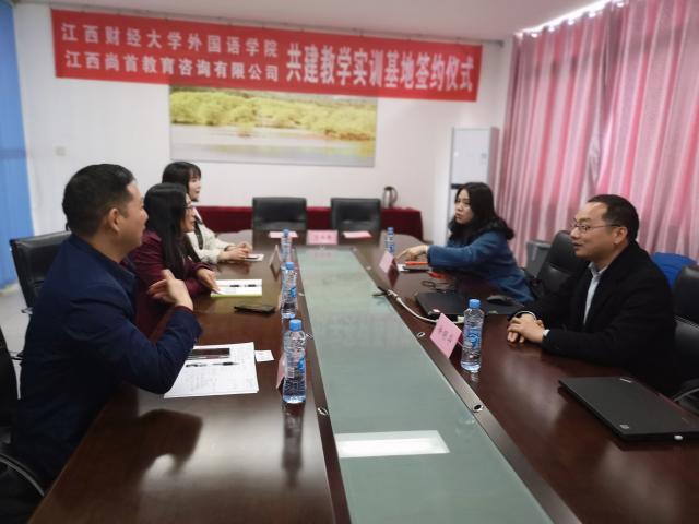 3月19日上午,外国语学院与江西尚首教育举行就业实习实训基地签约仪式。江西尚首教育咨询公司总经理徐明、项目部负责人徐明华,外国语学院院长张曦凤,党委书记涂远武、日语系主任陶萍出席签约仪式。