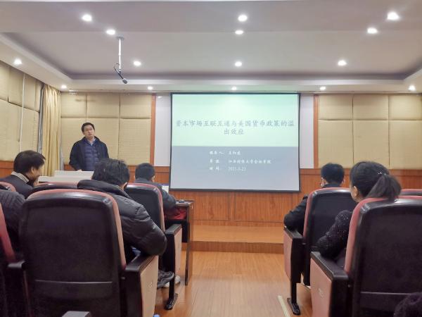 3月23日上午,第90期蛟湖金融论坛在金融学院东头会议室成功举办。论坛邀请王红建博士做“资本市场互联互通与美国货币政策的溢出效应”专题分享。金融学院副院长肖峻主持会议,学院部分老师和研究生参加会议。