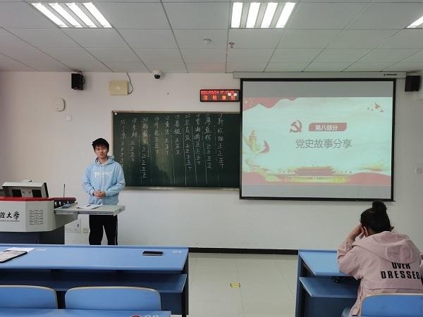 主题班会开展前,全体同学合唱校歌。班会伊始,主持人借助PPT形式向全体同学开展党史学习教育。主持人引用习近平总书记开展党史教育讲话中的“正当其时,十分必要”,向同学们阐释学习党史的必要性。随后,主持人用形象直观的图表向全体同学展示党史发展的主要脉络和意义,让同学们重温中国共产党波澜壮阔、艰辛曲折的奋斗史。胸怀千秋伟业,恰是百年风华。紧接着,主持人借助视频详尽地向同学展示中国特色社会主义道路的必然逻辑。活动最后,主持人与全体同学分享自己家乡的党史故事《勿忘三七》,展示老一辈中共党员的风采。