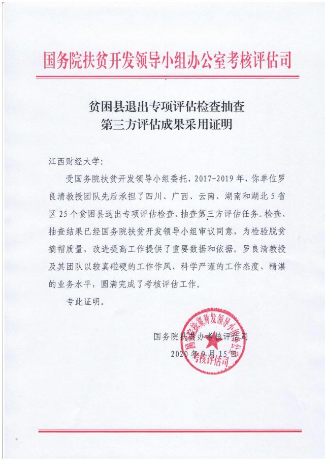 从2015年到2020年,从贵州到云南,从四川到湖北,作为国务院扶贫办十支权威第三方评估团队之一,以中共党员罗良清教授为首席专家的江西财经大学团队,在习近平新时代中国特色社会主义思想的指导下,以党的建设为引领,先后组织以统计学院师生为主的300余人次教师,带领着526支核查队伍,师生共计5000余人次,深入云、贵、川、鄂、桂、湘、赣等8省份、324个贫困县,投身精准脱贫攻坚战的贫困县退出核查等项目,在深度了解党情国情民情中践行“敬业乐群、臻于至善”江财精神,引导广大高校教师把最具价值的“论文”写在祖国大地上,教育广大学生把最具温度的社会实践放在乡村田野,获得了国务院扶贫办及各有关地方政府的一致好评和当地干部群众的普遍赞誉,为国家脱贫攻坚和精准扶贫事业贡献了江财智慧,彰显了江财担当。