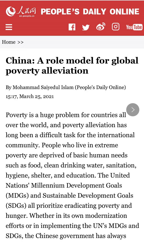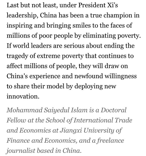 文中写道,“在以习近平同志为核心的党中央坚强领导下,中国在减少绝对贫困方面是一个真正的冠军。通过消除贫困,使得数以百万计的贫困人群露出了笑容。如果世界其他国家的领导人想结束持续影响数百万人的赤贫悲剧,他们可以借鉴中国的减贫经验和模式。”