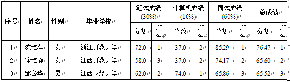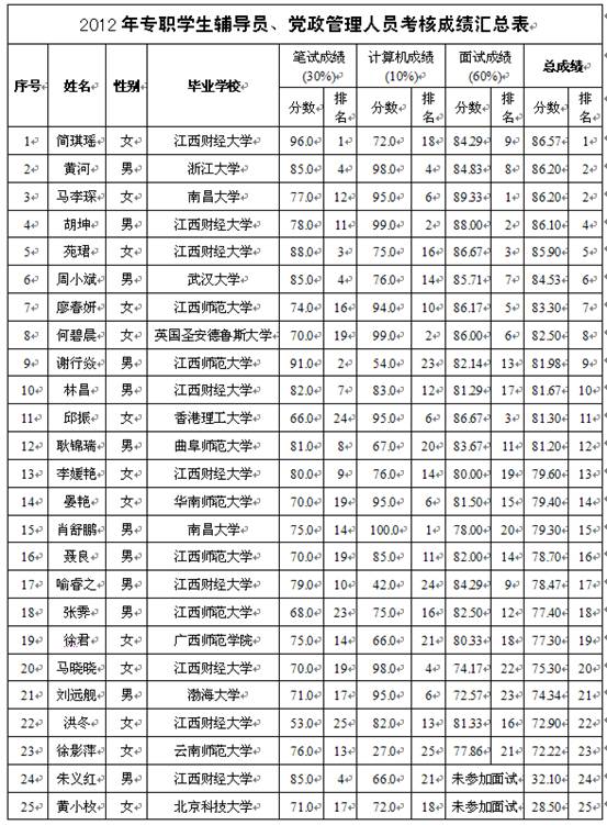 为进一步加强大学生思想政治教育工作,优化专职学生辅导员及党政管理岗位人员队伍,我校拟招聘人事代理10名优秀硕士担任专职学生辅导员、党政管理人员。通过2012年3月14日和3月28日两个阶段(综合能力测试、面试)的公开选拔,参聘人员均发挥了自身的水平。现按照考核成绩的排名顺序,对拟录用的10人,总成绩前九名和艺术类专业考生第一名进行公示,名单如下: