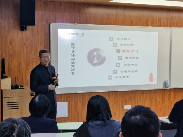 刘爱军教授是国家精品在线开放课程(线上一流本科课程)和国家级线下一流本科课程《孙子兵法与企业运营》的负责人,他分享了自己二十多年的课程建设经验,指出混合式学习已是人才培养大趋势,强调课程教学需要设计、规范、技术、团队和专注,课程建设要同步课程群发展、教学成果培育等内容。他结合《孙子兵法与企业运营》说课视频,对一流本科课程申报材料的准备作了指导。