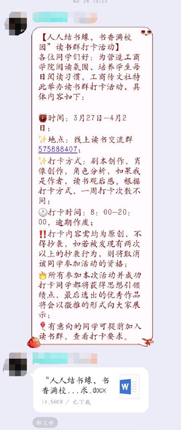 本次活动以线上打卡的形式展开,为方便学生相互交流,工作人员组建包括全体活动成员在内的“儒风雅韵,观书读燕”线上读书群。工商学子可通过读书群发送自己的读书笔记或原创故事完成打卡目标,打卡内容分为剧本创作、肖像创作、角色分析、如果我是作者、读书观后感五个模块,活动成员可自选其一完成。