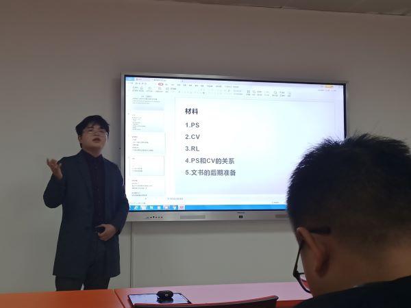 其次,是刘力学长向我们讲述出国必备条件和具体准备!学长介绍出国条件主要有三项:硬性条件,软性条件,材料准备方面。硬性条件首先是GPA,学长建议大家可以从以下几个方面提高自己的GPA:首先在大二时申请交换生可以提高加权,认真修二专,刷分,重修,学分置换,上超星尔雅课程等方面做好,都可以提高GPA。条件二是软性条件,主要可以从科研,实习,暑校,雅思,专利,申请软著等方向出发,提高自己的含金量!最后为材料准备:PS(Personal statement),CV(Curriculumvitae),RL(Recommondletter),PS和CV的关系,文书的后期准备这些都需要好好下功夫,学长最后祝愿大家有出国想法的人都能得偿所愿。