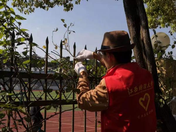 活动伊始,青协负责人为志愿者们分发手套、扎带等劳动用具并带领他们前往指定区域进行藤本月季的护理。通过园林师傅对花草护理工作的讲解和指导,同学们了解到护理工作的重要性,在园林师傅的指导下,志愿者们前往蛟桥园北区运动场外的绿地,男生携带绑带等工具固定藤本月季,女生开始清理绿地中的杂草和小竹竿。随后,志愿者们自觉分开到每块栅栏前,仔细检查月季花的状况,拔除已松动的竹竿,固定散落的花藤,使月季花能正常生长。
