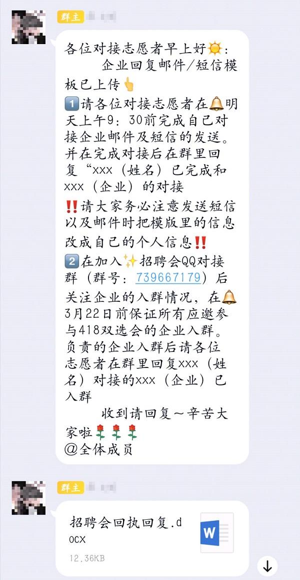 4月1日,为明确志愿者的工作内容,准备工作的相关负责人开展工作会议,全体志愿者积极到场参与交流沟通。会议中,负责人通过QQ群向志愿者们发放企业回复模板、招聘会回执回复模板、志愿者工作流程及常见问题等文件。准备工作要求志愿者收集各企业有关招聘会的诉求,并及时向相关部门转达,为企业对接人员答疑解惑。负责人强调,志愿者在对接企业时应当注意文明礼貌,体现工商管理学院优秀的人文素养。