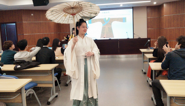 在古筝琴弦的轻轻拨动中,体会到一曲千年的金玉良缘;此时身着不同汉服的国际学院的学生们缓缓向我们走来,展示着典雅的中华汉服之美。汉服是汉民族传承四千多年的传统民族服装,而今,汉服已经不再是普通衣物,而是中国文化代表与象征。汉服体现了汉民族柔静安逸、娴雅超脱的民族性格,以及含蓄委婉、典雅清新的审美情趣。