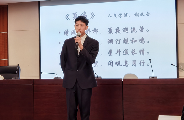 人文学院的学子们也带来了他们的原创诗歌与我们分享。夜晚不知何人唱,凄凄伊人只盼归---人文学院刘阳朗诵的是他创作的《盼归》;谢文全朗诵了他的原创作品《夏夜》;胡蓉朗诵了根据自己疫情期间的经历写成的诗歌《她》;刘子煜朗诵了自己创作的古体诗《古驿赋》。