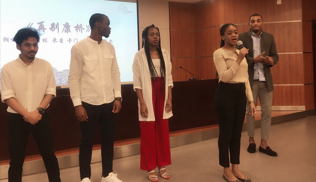 海外教育学院留学生胡林、米查、卡门、瑞娜、米格尔首先为我们带来了一首《再别康桥》。在他们富有感情的吟诵里,大家仿佛走入了康河的柔波,与河畔的金柳悄悄地对话。