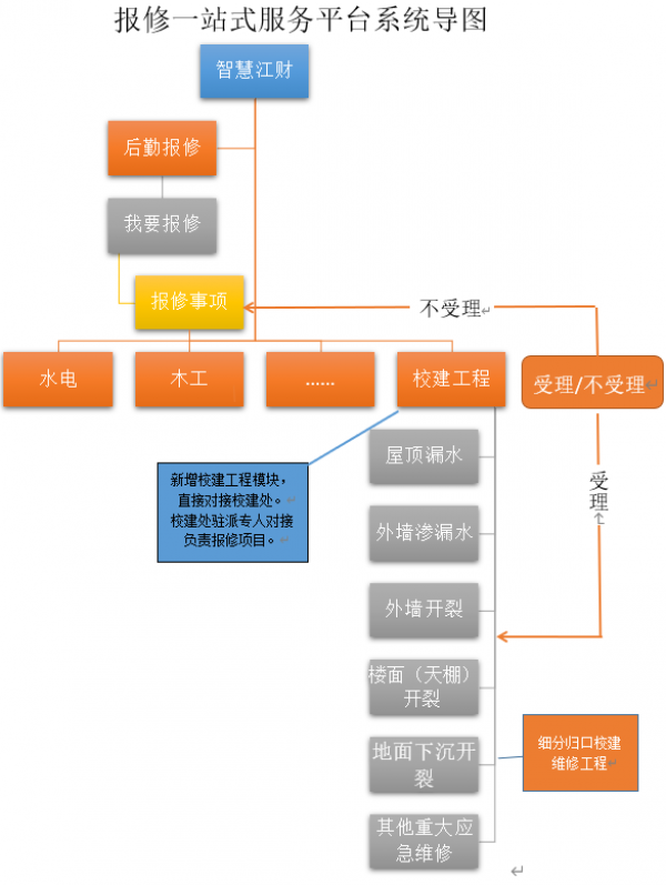 落实于“细”,逐条逐项细化报修内容。校园建设处在后勤报修事项中新增校建工程窗口,保证报修通道明晰。同时,细分校建工程报修事项,新增报修子模块,细分归口校建维修工程,减少报修环节出错。