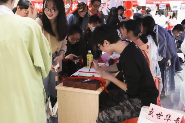 除了精彩的表演之外,更有各个国家的特色展厅,展厅中展示了各个国家的特色小吃,特色文化等。有趣的小游戏、可爱的吉祥物、丰富的小礼品更为文化节添了几分热闹之感。其中,在中传文的展厅,更有“写红带,寄祝福”“品中国茶”“敲编钟”等中国传统文化体验展厅,为整个活动带来了浓浓的中国韵味。这无不体现着国际学子在学习和了解外来文化的同时,也以中华优秀传统文化为荣,对中华优秀传统文化怀有深切的认同感和归属感。