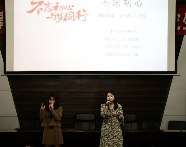 比赛第一阶段告一段落,评委代表梁钰鑫和刘子铉倾情对唱一首《不忘初心》,歌声婉转,高音嘹亮,歌唱祖国的同时也提醒着同学们不忘初心,继续前进。接着,比赛来到了第二阶段——“歌王争霸赛”。五名选手将按实时排名顺序由低到高,依次上台演唱,并由评委打分排名。最终,20级审硕刘涵仪、20级会计学戈梦辉以及20级会硕3班赖涵颖分别获得了本次歌手大赛的一、二、三等奖,20级会计学汤帅获得最佳人气奖。