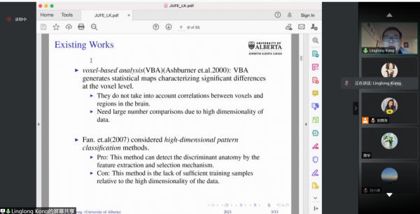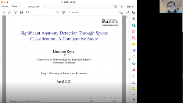 4月28日,加拿大阿尔伯塔大学数学与统计科学系孔令龙教授应邀为统计学院师生作了一场题为“Significant Anatomy Detection Through Sparse Classification:A Comparative Study”(基于稀疏分类的重要解剖结构检测的比较研究)的线上直播讲座。该讲座由学院副院长刘小惠教授主持,学院60余名师生代表聆听。