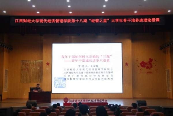 近日,现代经济管理学院院长王金海教授以“青年干部如何树立正确的“三观”——青年干部成长进步六要素”为主题,在明德大学生活动中心101为第十八期“经管之星”大学生骨干培养班学员授课。