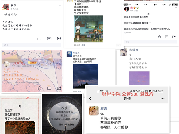 5月22日,工商管理学院心理健康促进协会于线上举办“以诗写我心,字字传真情”525特色活动。本次特色活动以三行诗的形式开展,旨在帮助江财学子正视自己的沟通需求,提升自身情感表达能力,优化心理素质,保持健康心理。
