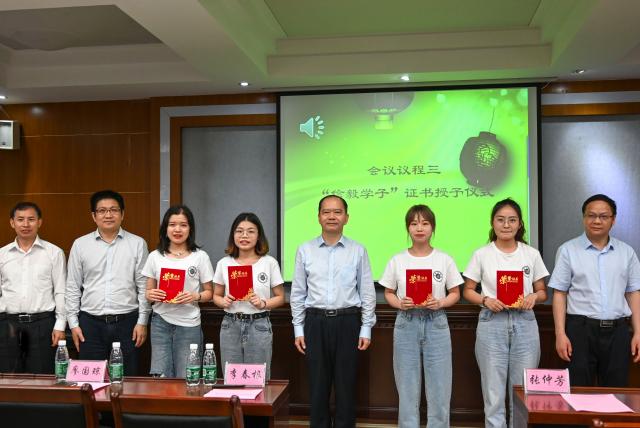 李春根,教务处处长廖国琼,财税与公共管理学院院长张仲芳、党委书记段远鸿共同为高级班同学颁发“信毅学子”证书。