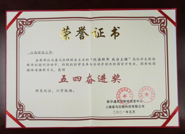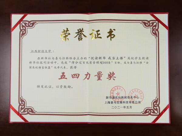 “悦读新华 我当主播”活动系“新华社重点报刊进校园”活动内容之一。该活动通过喜马拉雅APP朗读新华社报刊文章的方式,号召青年“燃烧五四薪火,扛起复兴大旗,用你的声音,造一场最敢青春'播'力量”。校党委宣传部积极组织,结合党史学习教育,引导青年读党报学党史,积极发声表达爱党爱国情怀。经过激烈的打榜竞争,最终获得“五四力量奖”“五四奋进奖”“优秀组织奖”;曾静茹、骆洋、华雨欣、杨紫玲、杨云婕5个同学的作品从140所高校1.3万余条参赛作品中突破重围,成功“摘星”120强,获得“播力摘星奖”。
