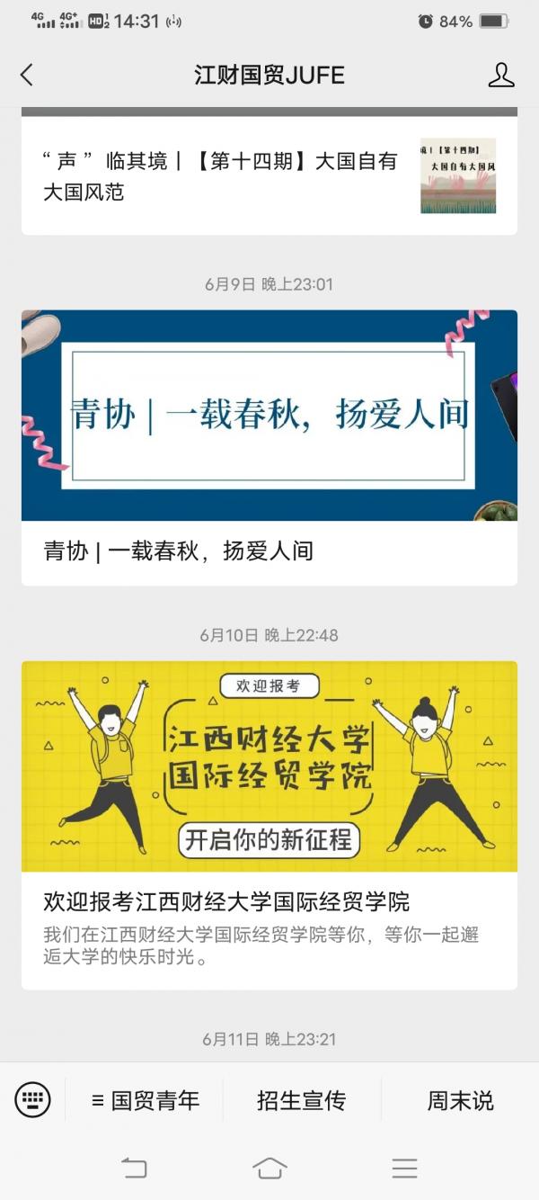 国际经贸学院在招生宣传工作中既传承以往好的做法和举措,又注重结合互联网所特有的随时访问、双向实时交互的优点,探索新办法。除了在学院官方网站的招生专栏中设置了学院招生宣传文案,还灵活运用官方微信公众号——江财国贸JUFE,及时发布学院招生宣传微推,建立QQ群等,用学生日常接触多、互动及时方便的网络平台和工具,与考生实现“面对面”交流和沟通。充分发挥校友的媒介作用,依托各大校友会,通过qq群、朋友圈等发布21年学校招生宣传资料,吸引全国各地的优秀学子加入江财大家庭。学院教师们则利用新媒体平台,通过朋友圈,主动向亲朋好友推送招生信息,让学生和家长第一时间了解学院的招生信息和政策,取得了较好的宣传效果。