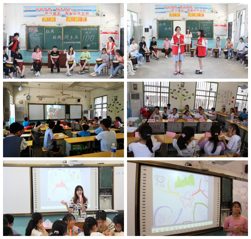实践团为草林中学的同学们带来丰富多彩的第二课堂美育活动,包括鼓圈、红色歌曲教唱、编排原创红色小短剧《红军与遂川人民》、开展辩论赛、根据草林红色标识构画思维导图等。通过节奏的镜像练习、声势训练和情绪标题的鼓声训练,锻炼同学们的专注力以及手脑的协调能力。在教唱红色经典歌曲《毛委员和我们在一起》的活动中,汉语国际教育专业的陶园章艺为同学们讲述了该作品的创作背景,带领同学们练习歌词中的鼻边音,纠正同学们的普通话发音。新闻传播专业的张丽花负责教唱歌曲,殷微微老师带着同学们敲击非洲鼓、沙锤等多种打击乐器为歌曲伴奏。来自社会学系的龙杰,以红色圩场为历史背景为同学们创作红色小短剧《红军与遂川人民》,主要讲述了1928年红军被国民党包围时,在毛泽东同志的带领下,设立圩场作为物资来源方式并成功在遂川建立根据地的故事,表现了红军与人民的鱼水之情。课间十分钟,实践团队播放了学院拍摄的红色微电影《井冈红3——寻遇》,同学们跟随电影,再一次重温了井冈山的革命历史,感受当下美好生活的来之不易。随后,同学们开展了一场以“苦难和辉煌哪个更能补充中学生的红色营养”为题的激烈辩论赛。最后,实践团将同学们分成7组,通过思维导图,小组合作画出心目中的家乡——红色小镇草林。