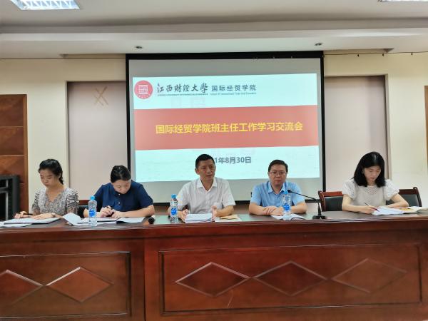 2021年8月30日上午9:30,国际经贸学院2021-2022学年班主任工作学习交流会在翼轸楼31106会议室举行。院长吴朝阳、学院党委书记廖勇勇出席会议,会议由学院党委副书记马李琛主持,学工办公室主任苗翠琴、团委书记周妍、辅导员吴梦以及各年级班主任老师参加会议。