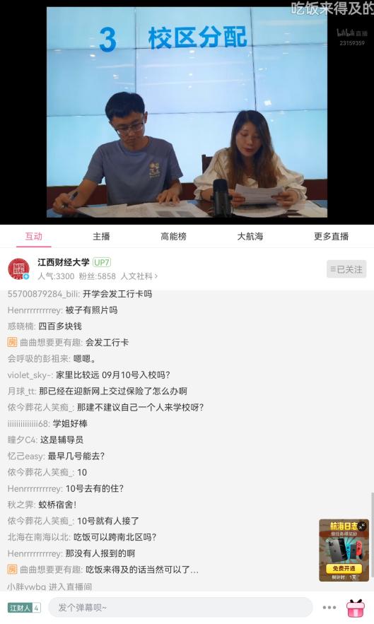 “老师,报到的时候家长可以进校园吗?”“军训需要剪头发吗?”“入校核酸检测有什么要求吗?”……8月31日下午,党委宣传部、文明校园建设办公室在学校官方抖音、微信视频号和B站举行了一场主题为“新计划”的新学期直播。