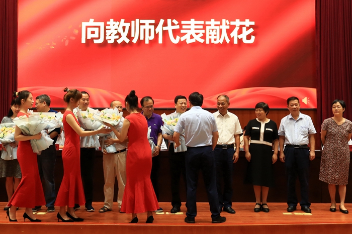 校长邓辉向优秀教师代表献花。