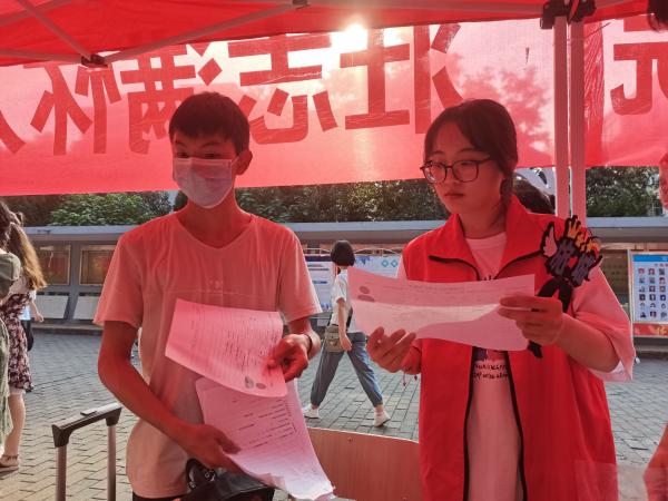 在火车站,江西财经大学的志愿者们守候在特定的地点,迎接新生,送他们顺利来到校园。走进校园,入目即是整齐排列在路边的红色帐篷,这些是各个学院的迎新点。旅游与城市管理学院的迎新点设置在和庐楼下,帐篷旁边放置了两块展板、三幅海报,介绍了学院四个专业的基本情况、就业率以及优秀毕业生去向等,便于新生们初步了解学院专业。迎新点帐篷内坐着21级班级的助班,为新生办理报到手续,还有专门为办理了助学贷款的新生服务的绿色通道,更有来自旅游与城市管理学院特色社团——茶艺社的学姐们,她们身穿茶人服,为风尘仆仆的学弟学妹递上一杯清甜可口的茶。帐篷外,一个个身着红马甲的身影奔忙于接驳车与寝室楼之间,这些是可爱的志愿者们,他们正在给新生搬运行李并帮助他们熟悉校园,其中旅游与城市管理学院的志愿者们头戴印有“旅城”二字的头箍,在校园内各个需要帮忙的地方都能看见他们的身影,形成了一道独特且靓丽的风景线,体现出学院的热情与真诚。