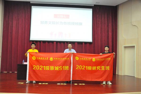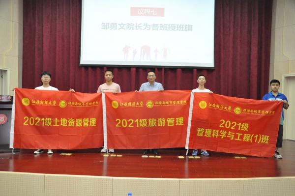 期间举行了授旗仪式,院长邹勇文为学院2021级各专业新生班授旗。