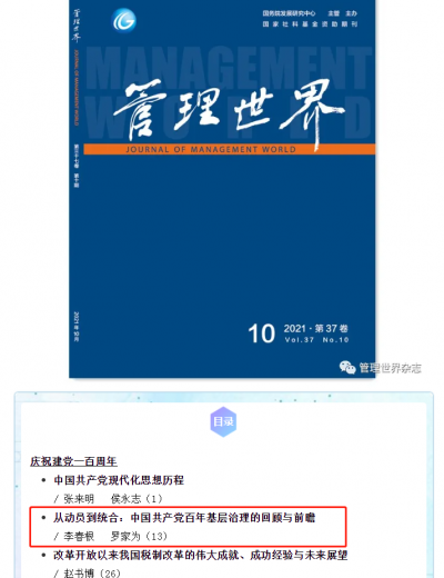 近日,李春根教授在国内权威A类期刊《管理世界》2021年第10期“庆祝建党一百周年”栏目,发表学术论文《从动员到统合,中国共产党百年基层治理的回顾与前瞻》。
