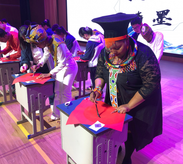 活动最后,,我校留学生们与来自南昌市外国语学校的学生们一起用毛笔写下了“万里南昌齐会,四海一家同心,欢聚南外”的对联,与现场700余名师生一起合唱“Dream it possible”。