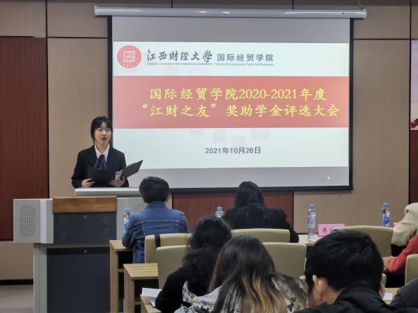 1028日下午,国际经贸学院举行2020—2021年度“江财之友”奖助学金评选大会。学院党委副书记马李琛,学工办主任苗翠琴,团委书记周妍,辅导员吴梦、熊瑛及班主任代表参加会议并担任评委老师。