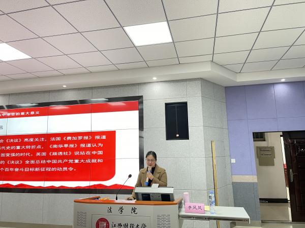 12月8日,马克思主义学院副教授李凤凤为法学院师生作专题宣讲,宣讲会上李凤凤围绕《中共中央关于党的百年奋斗重大成就和历史经验的决议》从全会重大意义、党的百年奋斗四个伟大成就、五个历史意义、十个历史经验等五个方面,充分结合党史以及国际国内实事展开宣讲。宣讲会后,郭海峰表示,今后法学院要不断创新思政课的“教学形式”,加强课程思政,把全会精神融入教学,帮助同学们牢牢把握人生航向,自觉把个人梦融入到中华民族伟大复兴的中国梦之中,全面提高报效祖国和人民的政治觉悟和实践本领。