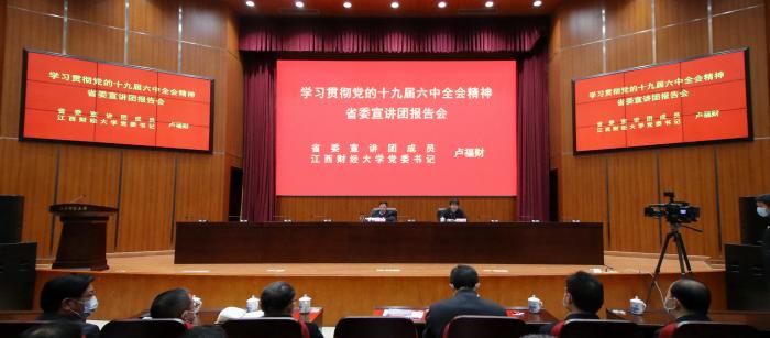 按照省委统一部署,12月2日下午,我校举行了学习贯彻党的十九届六中全会精神省委宣讲团报告会。学习贯彻党的十九届六中全会精神省委宣讲团成员、校党委书记卢福财为我校师生进行宣讲。校长邓辉主持报告会。校领导、校党委常委,校属各单位副处级以上领导干部,党史学习教育领导小组办公室成员,校党史学习教育宣讲团成员,基层党支部书记代表,研究生百年党史宣讲团成员以及井冈学子先锋班学生代表等近300人共同聆听了报告。